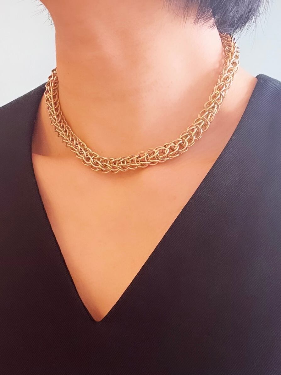 複数の細かなチェーンが組み合わされた、大胆さと繊細を兼ね備えたデザイン。